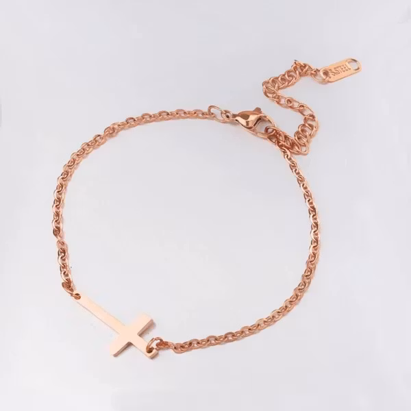 Ett stilrent armband i varm roseguldston med ett litet korshänge som bär på både skönhet och mening. Den tunna, eleganta kedjan gör det till ett perfekt vardagssmycke som också passar till festligare tillfällen. Låt det bli en personlig detalj i din smyckeskollektion.
