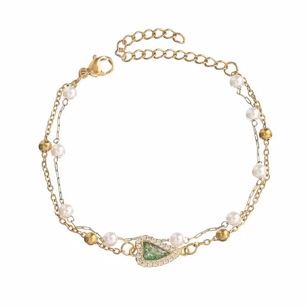 En charmig färgklick med ett glittrande grönt hjärta som fångar blicken direkt. Armbandet kombinerar eleganta pärlor med en nätt dubbelkedja i guldton – en perfekt detalj för både vardag och fest. Det gröna hjärtat ger smycket ett livfullt uttryck med en känsla av friskhet och energi.