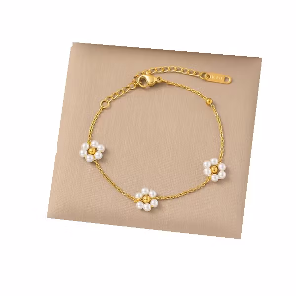 Ett romantiskt armband med tre små blommor av skimrande pärlor som fångar ljuset från alla vinklar. Den tunna guldfärgade kedjan ger en nätt och feminin känsla. Perfekt att bära ensam eller kombinera med fler favoriter.
