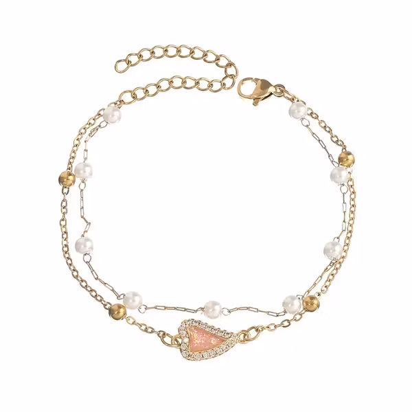 Ett romantiskt armband med glittrande detaljer och rosa hjärta som mittpunkt. De skimrande pärlorna och dubbla kedjorna ger ett elegant och lekfullt uttryck. Perfekt för att lyfta både vardagslooken och feststilen. Den lilla hjärtformen glittrar vackert i ljuset och fångar blicken direkt.