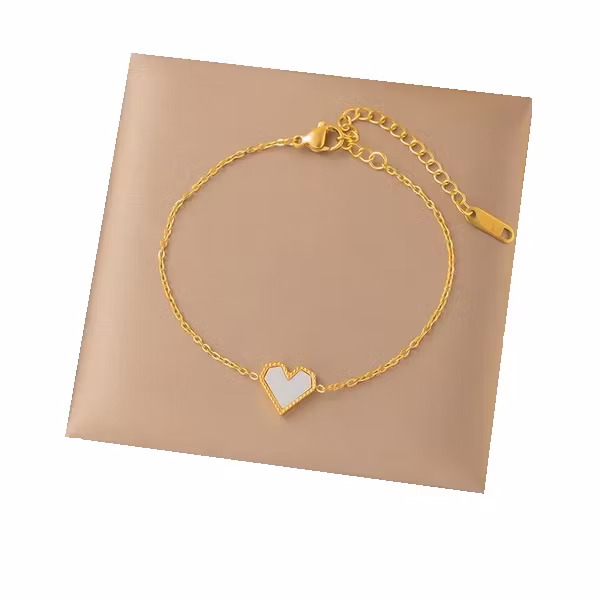Fint och romantiskt armband med ett vitt emaljhjärta som ger en stilren och feminin touch. Den tunna guldfärgade kedjan ger en elegant känsla som passar både vardag och fest. En underbar detalj att bära själv eller ge bort i present.