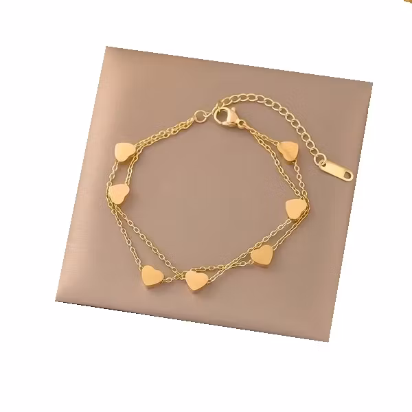 Ett charmigt armband som andas romantik! Den dubbla guldfärgade kedjan pryds av små hjärtan och ger ett elegant men lekfullt uttryck – perfekt för både vardag och fest. Justerbar längd gör det enkelt att anpassa efter din handled.