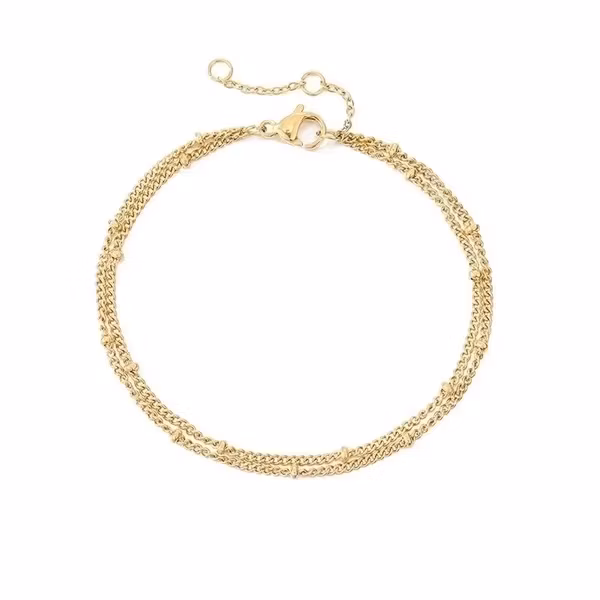 Ett stilrent och feminint armband som kombinerar tunn elegans med en lätt glittrande kedjestruktur. Den guldfärgade finishen ger en varm och exklusiv känsla som lyfter både vardagsoutfits och festligare stunder. Perfekt att bära ensamt för en diskret look eller i kombination med andra smycken för en personlig stil.