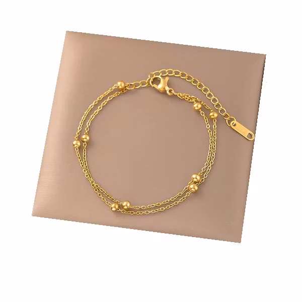 Ett stilrent armband i två tunna kedjor dekorerade med små kulor som ger ett mjukt och levande uttryck. Den gyllene tonen och den nätta designen gör det till ett lättburet smycke som passar alla tillfällen. Perfekt både ensamt och i kombination med andra armband.