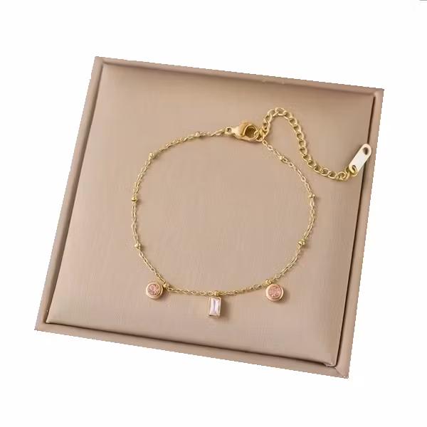 Ett feminint och sofistikerat armband för alla tillfällen. Tillverkat i guldfärgat rostfritt stål med tre gnistrande rosa zest-kristaller – två runda och en baguette-formad – vilket skapar ett modernt och lekfullt uttryck. Med justerbar längd från 16 till 20 cm passar det perfekt ensam eller tillsammans med andra smycken. En vacker detalj som ger en mjuk färgklick i vardagen.