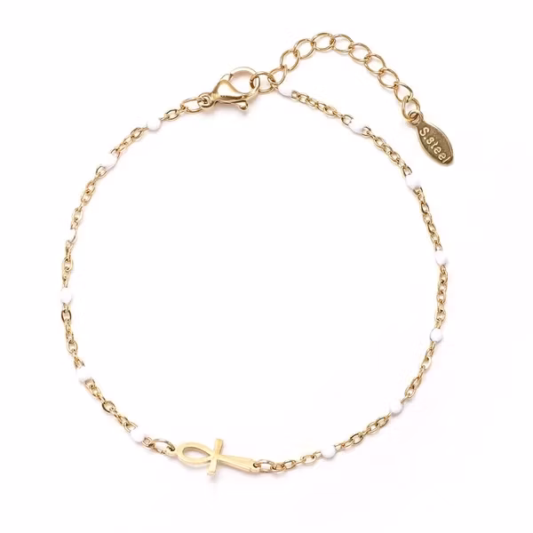 Detta eleganta armband kombinerar klassiska vita pärlor med en gyllene finish och en stilren Ankh-symbol. En tidlös detalj som passar lika bra till vardags som till fest. Den vita färgen ger ett fräscht uttryck och gör armbandet lätt att matcha med andra smycken.