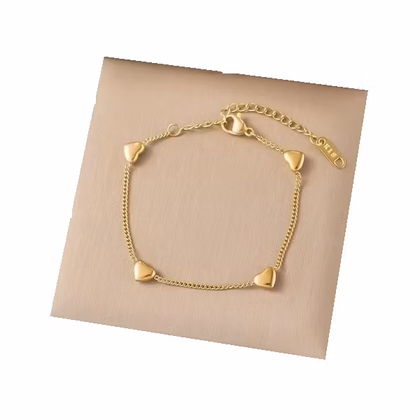 Förtrollande charm möter modern enkelhet i detta eleganta och nätta armband, utformat med varsamt placerade hjärtan som gnistrar mot huden. Tillverkat av rostfritt stål med en varm guldfinish, är det en tidlös accessoar som harmonierar perfekt med både vardagsklädsel och festliga outfits.
