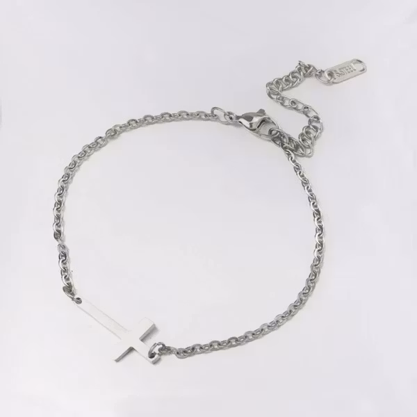 Detta silverfärgade armband med korshänge är en stilren detalj med djupare innebörd. Den tunna kedjan kombineras med ett liggande kors för ett modernt uttryck med tidlös symbolik. Lättburet och justerbart – passar perfekt både till vardag och mer högtidliga tillfällen.