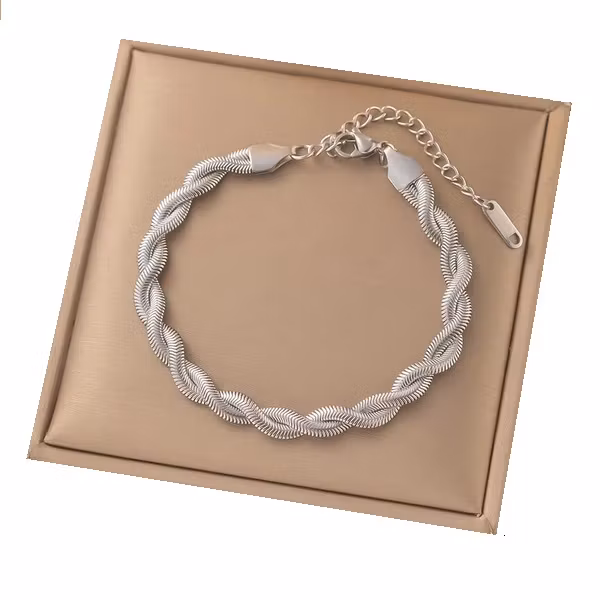 Detta flätade armband i rostfritt stål kombinerar en klassisk form med en modern, stilren känsla. Den tvinnade designen ger armbandet liv och struktur, samtidigt som den silverfärgade ytan gör det enkelt att matcha med både klockor och andra smycken. Ett mångsidigt armband som passar lika bra till vardag som till mer uppklädda tillfällen och som känns gediget utan att bli tungt på handleden.