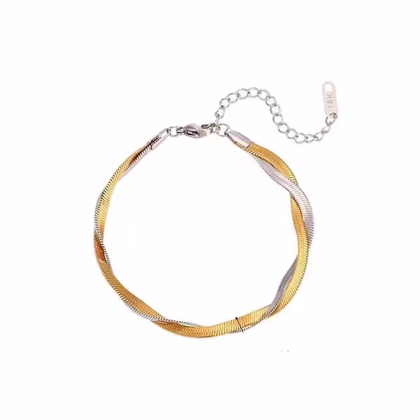 Ett elegant och stilrent armband med tvinnad form i både guld- och silverton. Den glittrande ytan fångar ljuset vackert och ger en exklusiv känsla till varje outfit. Perfekt för både vardag och fest – ett smycke som sticker ut med subtil elegans.