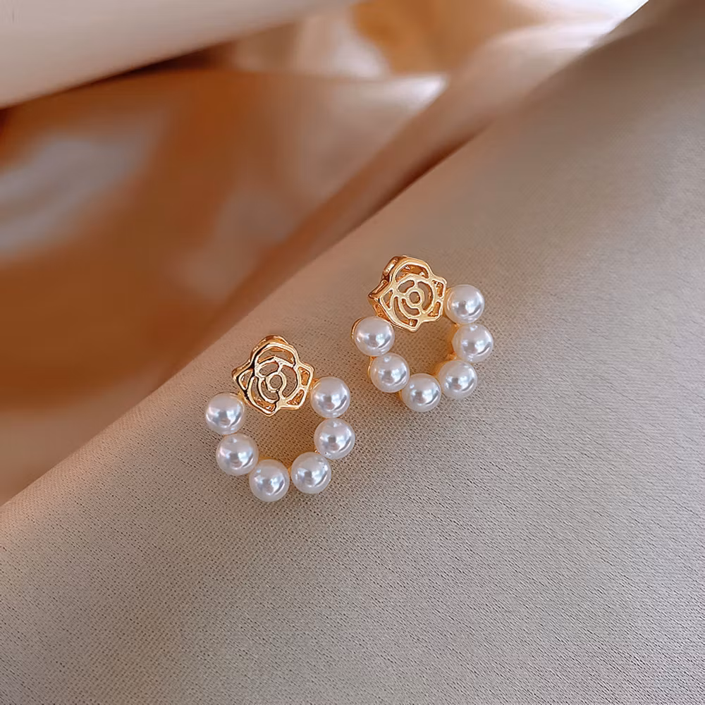 Dessa eleganta örhängen kombinerar klassisk pärlglans med en romantisk rosdesign i guldton. De små pärlorna bildar en mjuk cirkelform som ger ett stilrent och feminint uttryck, medan den dekorativa rosen ovanför tillför en unik och elegant detalj. Resultatet är ett smycke som känns både sofistikerat och lekfullt på samma gång. Perfekta för dig som vill ge din stil en diskret men charmfull detalj.