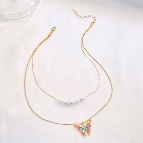 Låt din stil blomstra med detta drömlika dubbla halsband – en harmonisk kombination av elegans och lekfullhet. Den övre kedjan pryds av klassiskt vita pärlor medan den undre lyser upp med en färgstark fjäril i rosa, grönt och guld. En feminin accessoar som passar lika fint till sommarklänningen som till vardagens enklare toppar. Smycket gör intryck utan att ta över – perfekt för dig som gillar det lilla extra.