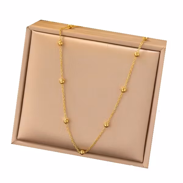 Detta stilrena halsband är skapat för dig som älskar enkel elegans och tidslös design. De små, polerade kulorna längs kedjan ger ett mjukt lyft till varje outfit – perfekt både till vardag och fest. Halsbandet är lätt, följsamt och enkelt att kombinera med andra smycken för en personlig look. Rostfritt stål ser till att du får ett smycke som håller sig vackert länge, utan att tappa sin lyster.