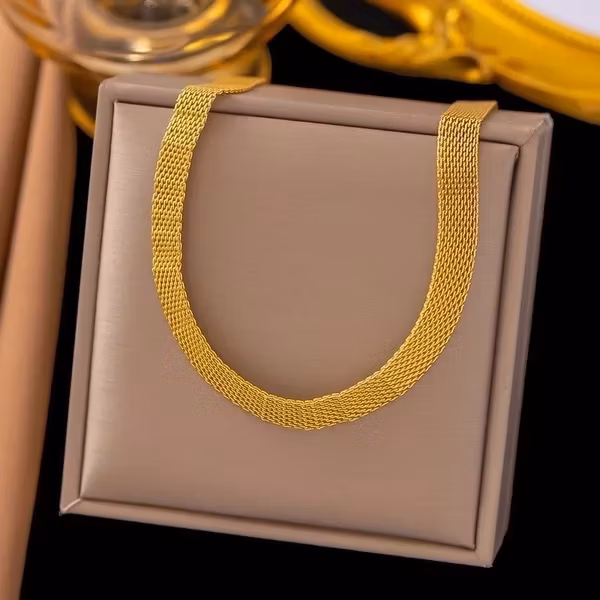 Det här halsbandet viskar inte – det talar högt och tydligt. Den breda guldfärgade meshkedjan ligger platt mot huden och skapar ett självsäkert, modernt uttryck med lyxig känsla. Perfekt för dig som vill kliva in i rummet och ta plats – utan att säga ett ord. Funkar lika bra över en enkel T-shirt som till djupa urringningar eller höga kragar.