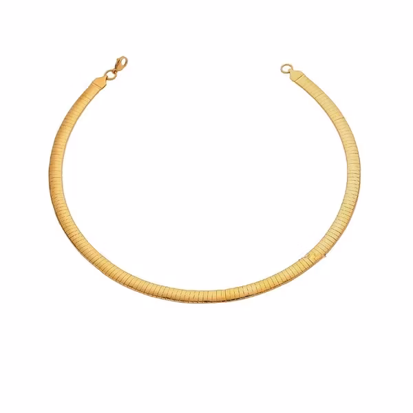 En stilren choker som för tankarna till tidlös elegans och modern styrka. Den glänsande guldfärgen ger en lyxig känsla, medan den breda formen framhäver din personliga stil på ett självsäkert sätt.
