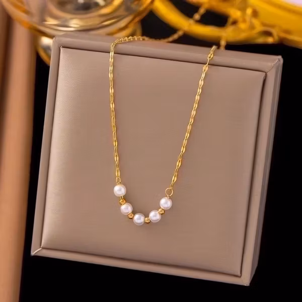 Diskret glamour med gyllene ton. Det här nätta halsbandet i guldfärgat rostfritt stål bär fem små pärlor i perfekt rad – tillräckligt för att glittra, men aldrig för mycket. Kedjan är lätt tvinnad för extra lyster och smycket passar lika bra som en vardagsfavorit som till mer uppklädda tillfällen. Elegant, enkelt och alltid användbart.