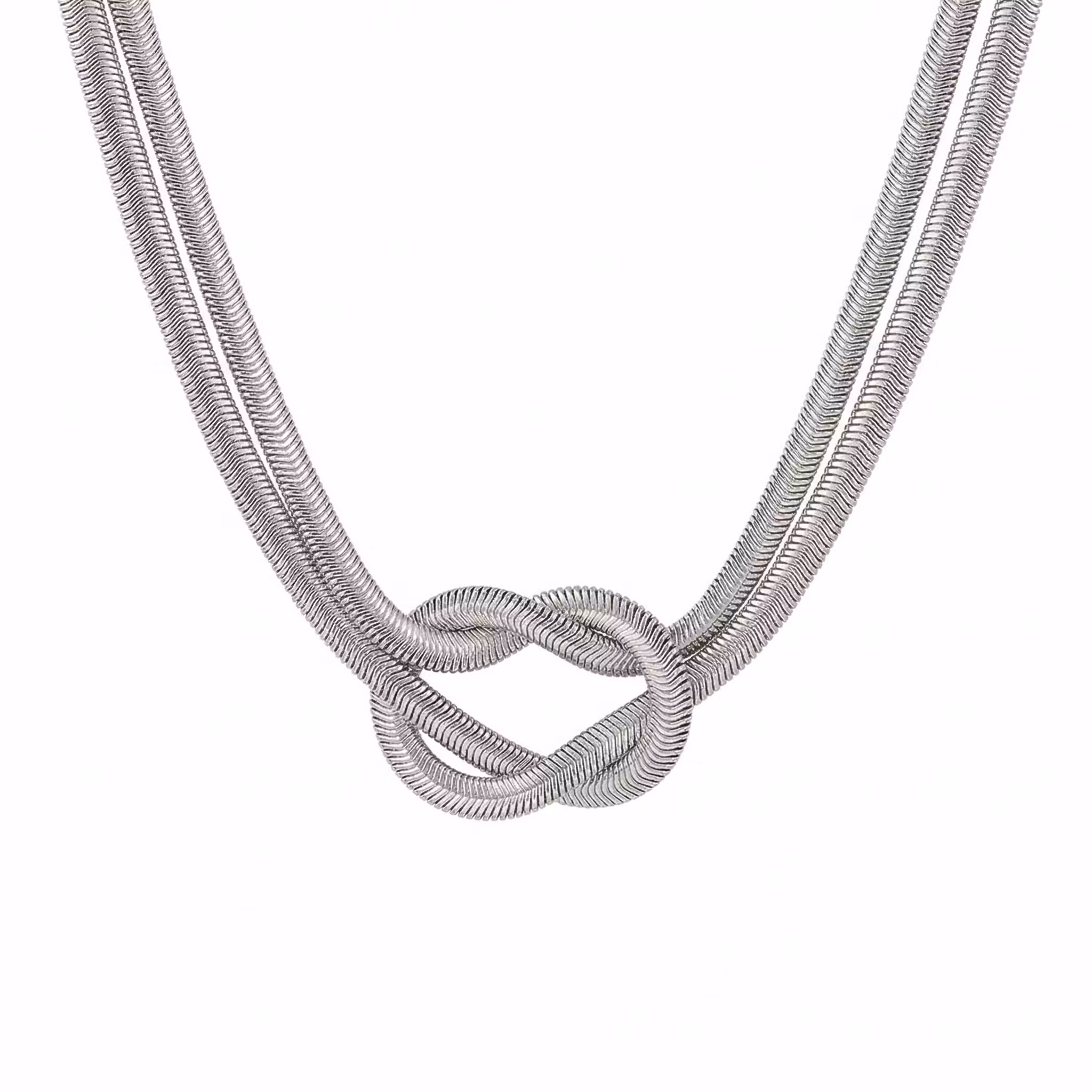 Detta exklusiva halsband i rostfritt stål förenar modern elegans med en tidlös symbolik. Smycket utmärker sig med en högblank ormlänk (snake chain) som faller mjukt och följsamt mot huden. I centrum sitter en fast, vackert formad knut som ger ett sofistikerat och stilrent intryck, perfekt för att addera en lyxig detalj till både vardagsgarderoben och festklänningen.