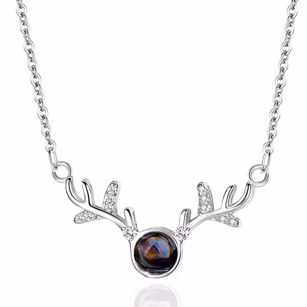 En gnista av vintermagi. Det här halsbandet med silverfärgade renhorn och en skimrande mörk sten i mitten för tankarna till frostiga skogar, norrsken och sagor man gärna bär med sig. De små kristalldetaljerna ger extra lyster, och designen är precis så unik att den lyfter hela din look – oavsett årstid.