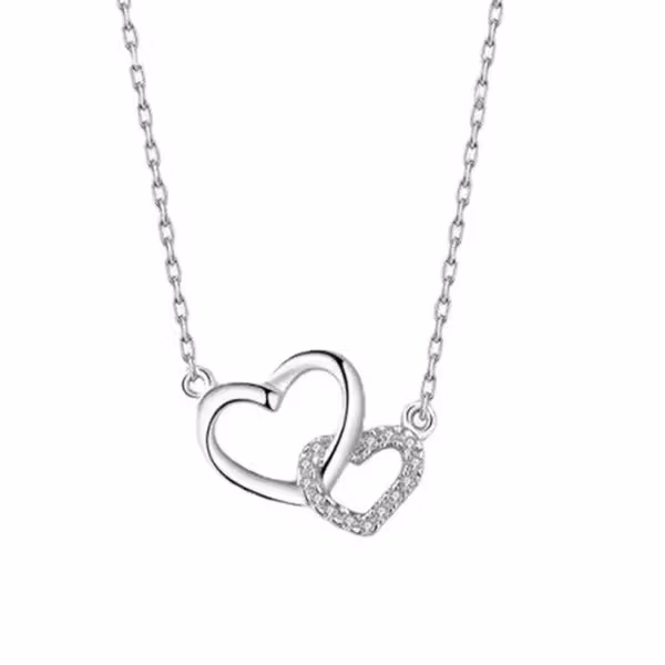 Ett romantiskt halsband med två sammanlänkade hjärtan – ett blankt, ett gnistrande. Den silverfärgade finishen i rostfritt stål ger en elegant känsla som passar både vardag och fest. En fin gåva till någon du håller kär, eller som symbol för din egen styrka och kärlek.