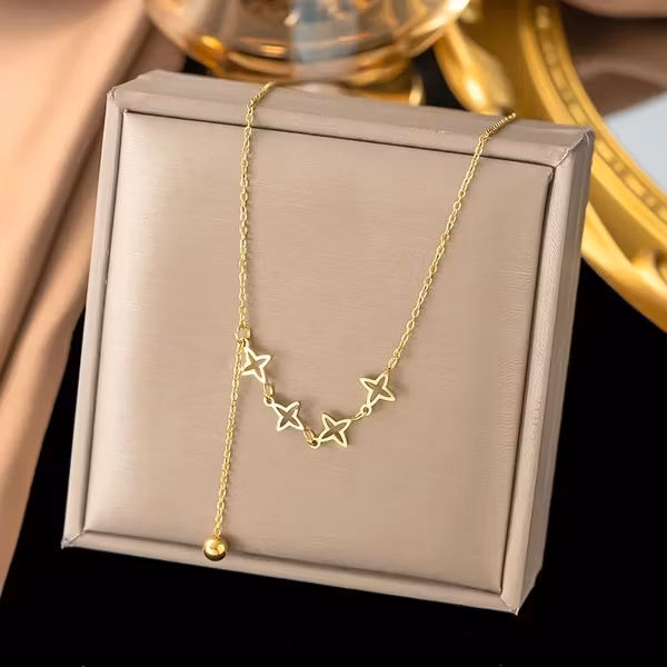 Ett lekfullt och stilrent halsband med fem små stjärnor i guldpläterat rostfritt stål. Den unika designen ger ett ungdomligt intryck och passar lika bra till vardags som till fest. Ett halsband som lyfter vilken outfit som helst med sin charm.