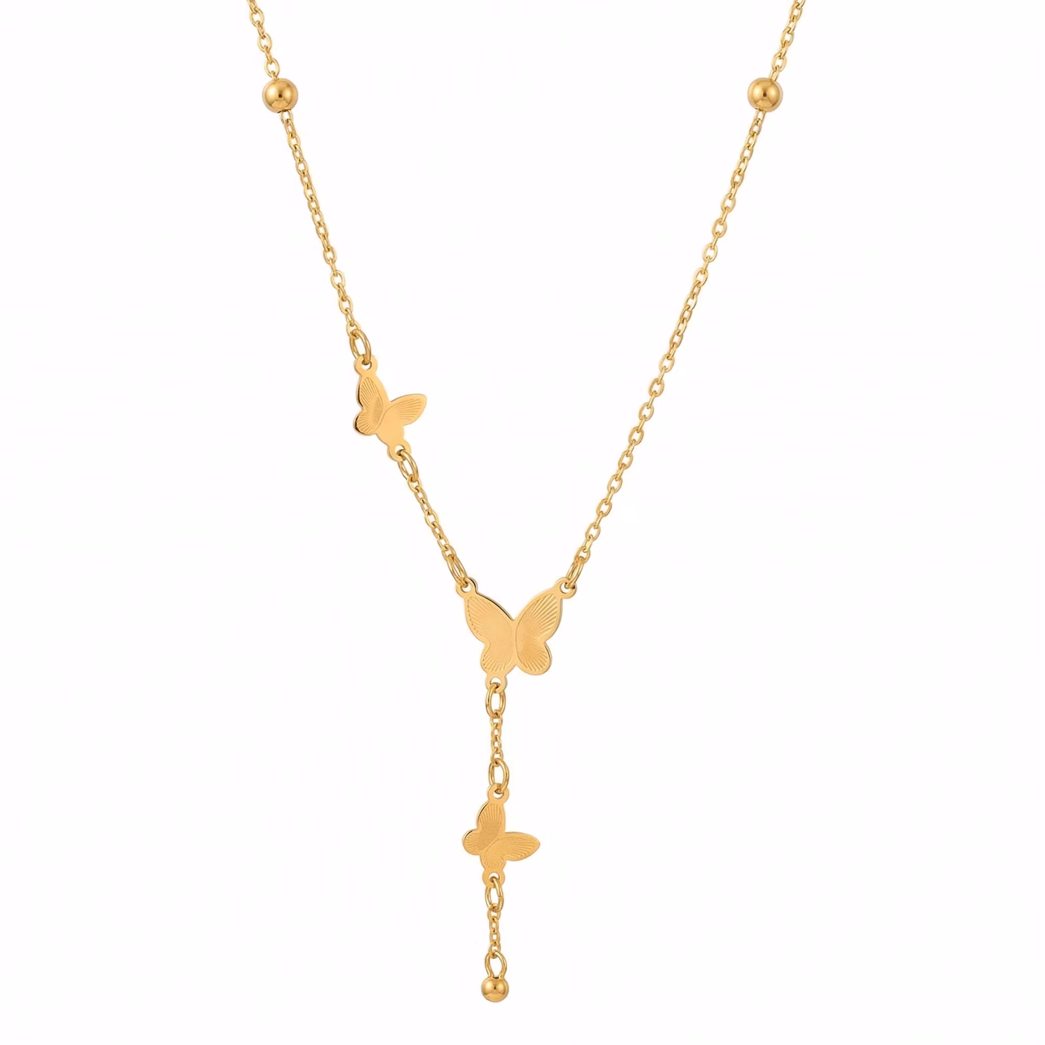 Detta förtjusande guldpläterade halsband i rostfritt stål är en hyllning till frihet och elegans. Designen pryds av tre nätta fjärilar i olika storlekar som är vackert placerade längs kedjan, vilket skapar en lekfull och asymmetrisk look. Den högblanka finishen och de fint detaljerade fjärilarna ger smycket en lyxig men samtidigt lättsam känsla som passar perfekt för att lysa upp vardagen.