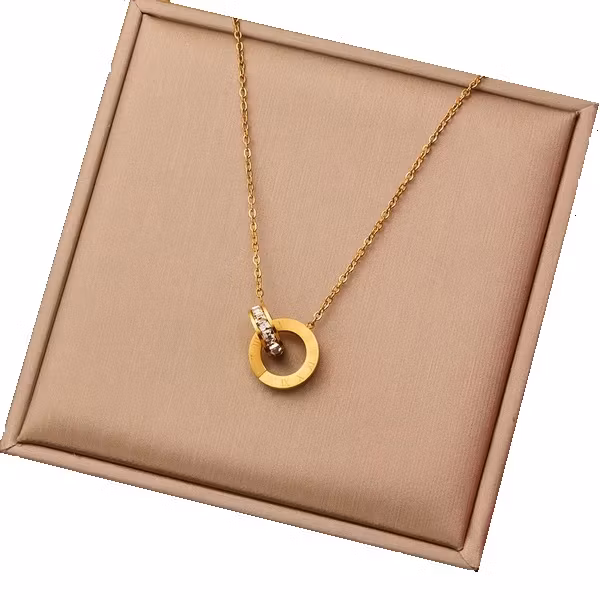 Detta sofistikerade guldpläterade halsband i rostfritt stål är en perfekt balans mellan klassisk elegans och modern design. Det iögonfallande hänget består av två sammanflätade ringar – en prydd med gnistrande kristaller och en med graverade romerska siffror. Symboliken bakom de länkade ringarna gör smycket till en meningsfull gåva eller en stilfull detalj som ger din outfit en lyxig och tidlös känsla.