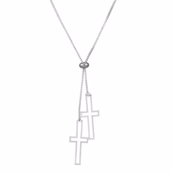 Ett stilrent kors med en modern twist – eller två, för att vara exakt. Det här halsbandet i rostfritt stål bär två öppna kors i minimalistisk design, hängande från en skjutbar pärla som gör att du enkelt justerar längden efter stil och tillfälle. En grafisk och kraftfull accessoar med både symbolik och stil.
