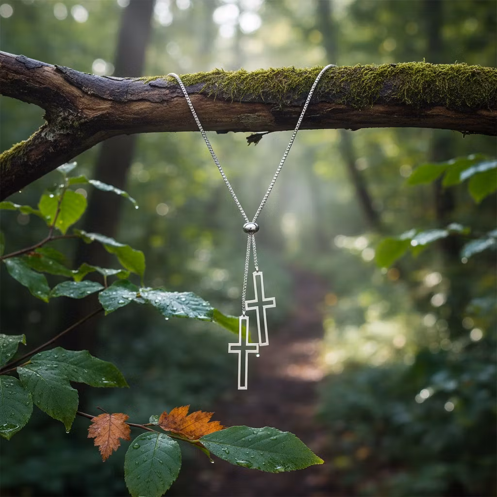 Detta stilrena halsband i rostfritt stål med silvrig finish förenar klassisk symbolik med en modern, minimalistisk estetik. Designen pryds av två eleganta, utskurna korshängen som hänger i olika nivåer, vilket skapar en sofistikerad och dynamisk look. Den högblanka ytan ger smycket en tidlös lyster som passar lika bra till vardags som till mer formella tillfällen.