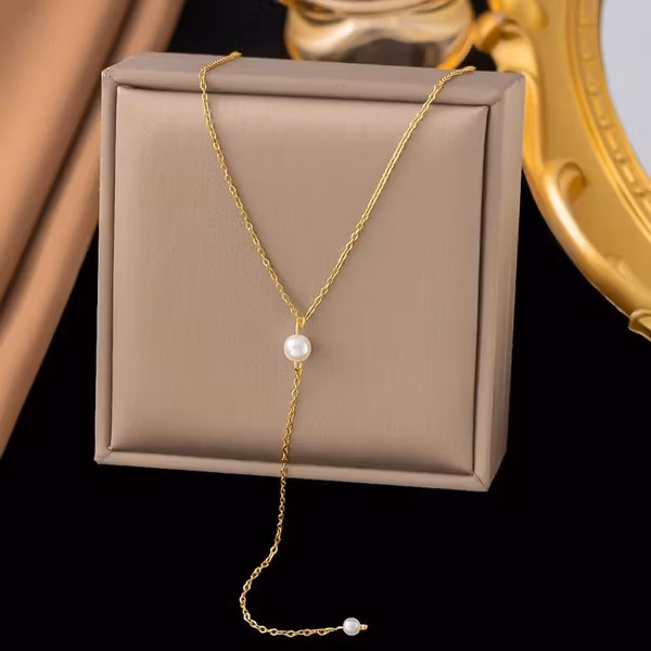 En mjuk rörelse, en diskret glans. Det här Y-formade halsbandet är prytt med två vita syntetiska pärlor – en centrerad vid halsgropen och en mindre som avslutning på det nedre hänget. Den tunna guldfärgade kedjan ger ett luftigt, elegant uttryck som passar både till v-ringade toppar och öppen skjorta. En modern klassiker med romantisk känsla.