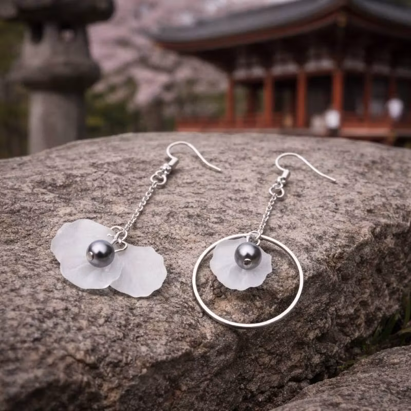 Dessa eleganta örhängen har en luftig och konstnärlig design där mjuka blomformer möter en tunn silverfärgad kedja. Den diskreta pärldetaljen ger ett sofistikerat uttryck medan den långa formen skapar en stilfull siluett längs ansiktet. Kombinationen av blomma och ring ger smycket en modern känsla med inspiration från japansk minimalism. Resultatet är ett par örhängen som känns både poetiska och stilrena.