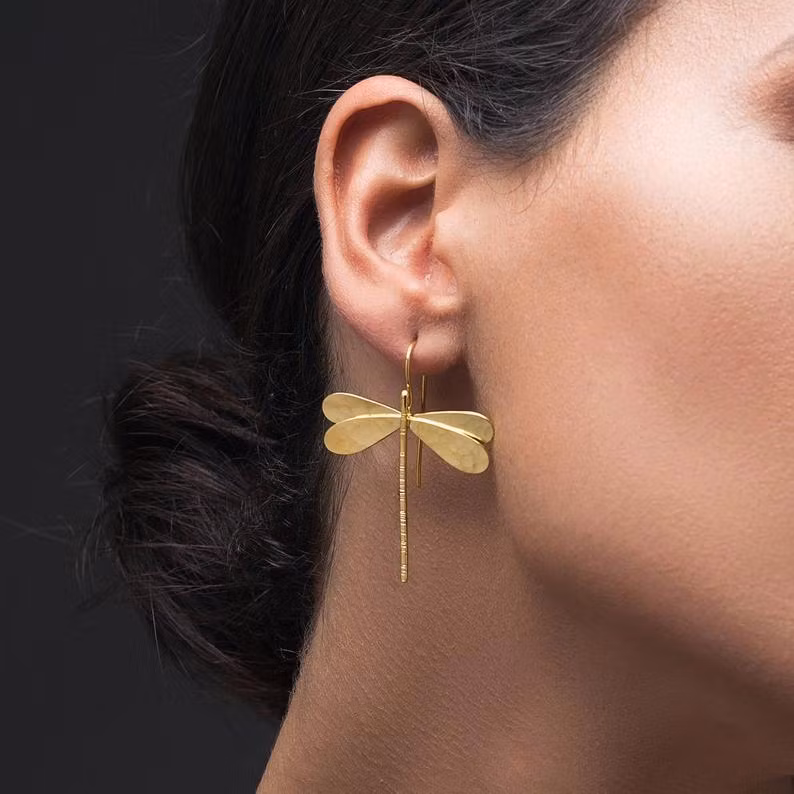 Dessa örhängen har ett elegant och konstnärligt uttryck där trollsländans form ger både rörelse och karaktär. Den hamrade ytan reflekterar ljuset mjukt och gör smycket levande utan att bli för mycket. Passar lika bra till vardag som till fest, och blir ett naturligt blickfång oavsett outfit.