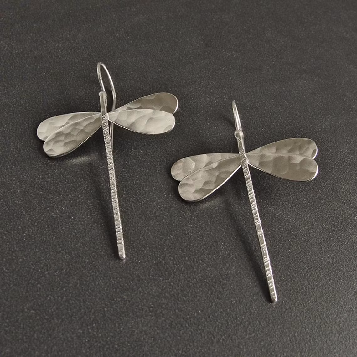 Dessa örhängen har ett svalt och stilrent uttryck där trollsländans hamrade yta skapar ett mjukt ljusspel. Den avlånga formen ger rörelse och gör smycket levande utan att kännas tungt. Passar perfekt både till vardagliga outfits och till mer uppklädda tillfällen när du vill ha något unikt men tidlöst.