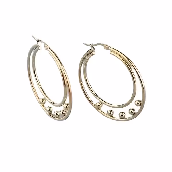 Dessa eleganta dubbelringade creoler ger en modern och exklusiv känsla som drar blickarna till sig. Den inre ringen hålls stilrent samman med små guldfärgade pärlor som rör sig lätt och reflekterar ljuset vid varje steg. Kombinationen av den tunna, rena formen och de små glänsande detaljerna gör örhängena perfekta både till vardags och fest. Tillverkade i rostfritt stål för lång hållbarhet och vacker glans.