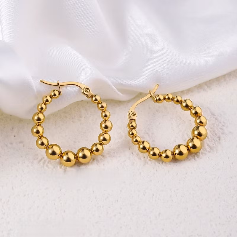 Ge dina outfits ett stilrent lyft med dessa glansiga pärlcreoler som fångar ljuset från alla vinklar. Den cirkulära designen byggd av små och större kulor skapar ett elegant men lekfullt uttryck – perfekta både till vardags och fest. Rostfritt stål gör dem slitstarka, färgbeständiga och lätta att bära hela dagen.