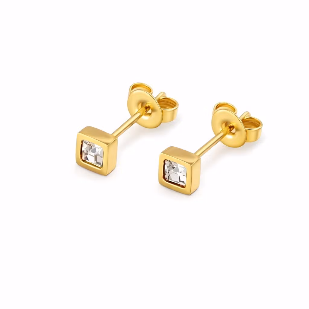 Dessa stilrena örhängen kombinerar en modern, fyrkantig form med ett elegant guldfärgat uttryck. Den klara stenen fångar ljuset på ett diskret men effektfullt sätt och ger ett lyxigt intryck utan att kännas överdrivet. Tack vare den kompakta storleken passar örhängena lika bra till vardag som till fest och fungerar utmärkt både ensamma och tillsammans med andra smycken. Ett säkert val för dig som söker bekväma, nickelfria örhängen i guldton som håller över tid.