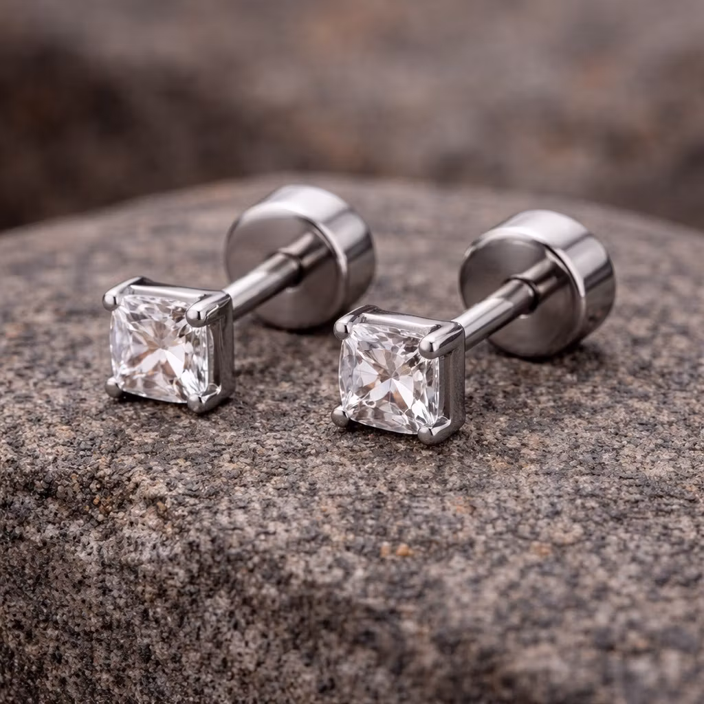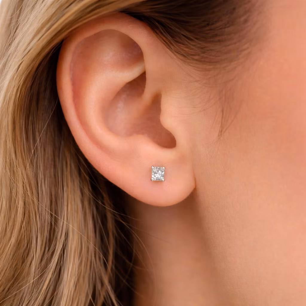 Fyrkantiga örhängen i rostfritt stål med klar sten i storlek ca 3 × 3 mm, nickelfria och lämpliga för daglig användning.