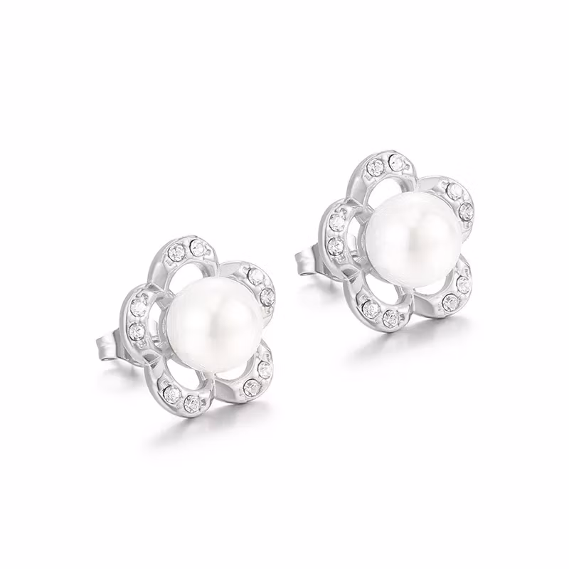 Dessa örhängen kombinerar en tidlös pärla med en blomliknande form som ramas in av små klara stenar. Resultatet är ett elegant och feminint smycke som passar lika bra till vardag som till festligare tillfällen. Den neutrala silvertonen gör dem enkla att matcha med andra smycken och olika stilar.
