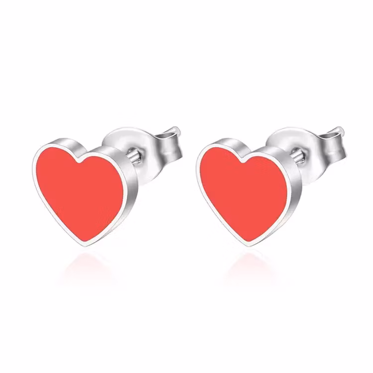 Små hjärtformade örhängen i rostfritt stål med röd yta och kompakt, lättburen design.