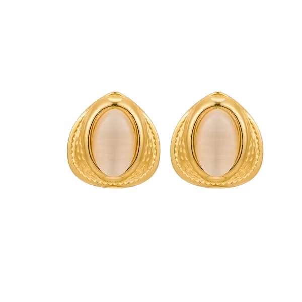 Stilrena och tidlösa örhängen i guldfärgat rostfritt stål med vackert oval sten och vintageinspirerad form. Den mjuka droppdesignen och den skimrande stenen ger ett elegant intryck som passar både till vardags och till fest. Tillverkade i rostfritt stål – perfekt för dig som söker hållbara och allergivänliga smycken.