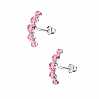 Eleganta stiftörhängen i rostfritt stål med infattade rosa stenar i en stilren, lätt böjd form. Den vertikala designen ger ett modernt uttryck och skapar ett fint ljusspel som ramar in örat på ett subtilt men iögonfallande sätt.
