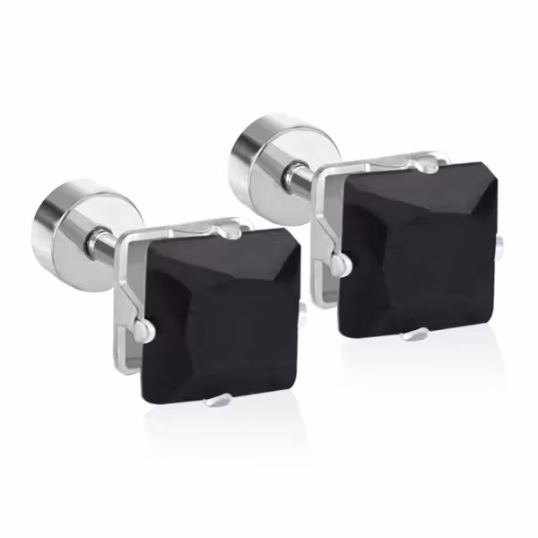 Svarta fyrkantiga örhängen i rostfritt stål med sten i storlek 6 × 6 mm och skruvstängning för säker passform.