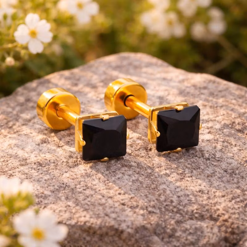 Stilrena stiftörhängen med en fyrkantig svart sten som ger ett tydligt och elegant uttryck. Den djupa svarta färgen skapar en stark kontrast mot den guldfärgade infattningen och ger örhängena en modern och sofistikerad känsla.