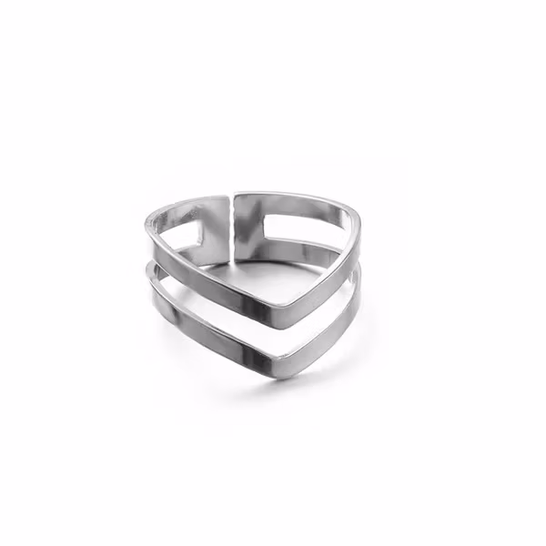 Två linjer, ett statement. Den här breda ringen i rostfritt stål har en distinkt V-formad design som skapar en modern, geometrisk känsla. En iögonfallande accessoar som passar lika bra till vardags som till fest.