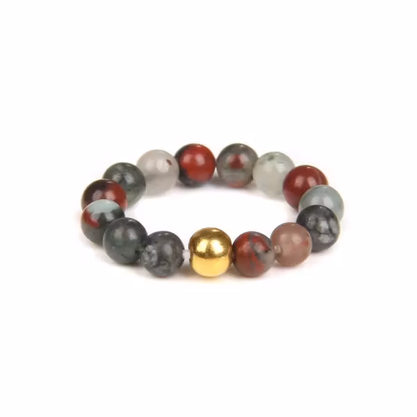 En ring med karaktär – här möts dova toner av grönt, rött och grått i ett mönster som för tankarna till natursten och jordnära balans. Den guldiga mittenpärlan blir en elegant mittpunkt som fångar blicken. Ett diskret men unikt komplement till både vardag och fest.