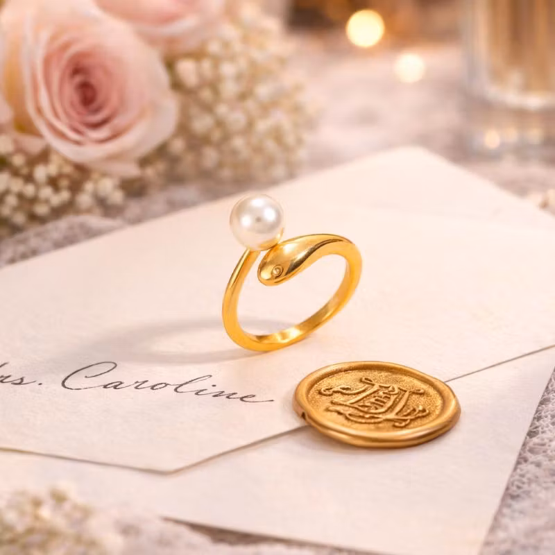 Den öppna konstruktionen gör ringen justerbar och flexibel i storlek. Den dekorativa pärlan blir ett tydligt blickfång samtidigt som ringen är lätt och bekväm att bära i vardagen.