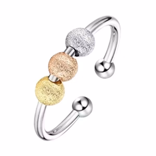 Elegant öppen ring i blankt rostfritt stål, dekorerad med tre pärlor i guld, roseguld och silver. En stilren mix som fångar blicken och passar till allt – lika fin solo som i kombination med andra smycken.
