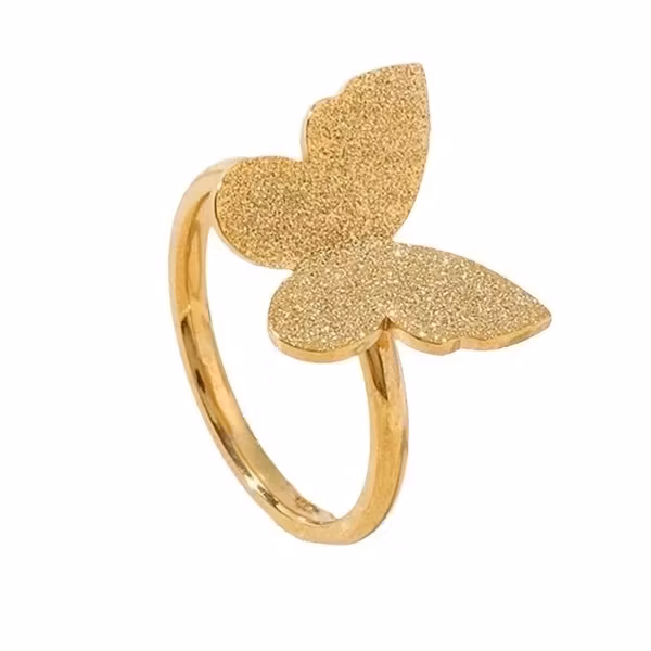 En fjäril som fångar ljuset och blicken – denna ring kombinerar lekfullhet med elegans. Den glittriga ytan på fjärilen skapar en levande effekt som får den att se nästan svävande ut. En perfekt detalj för både vardag och fest.