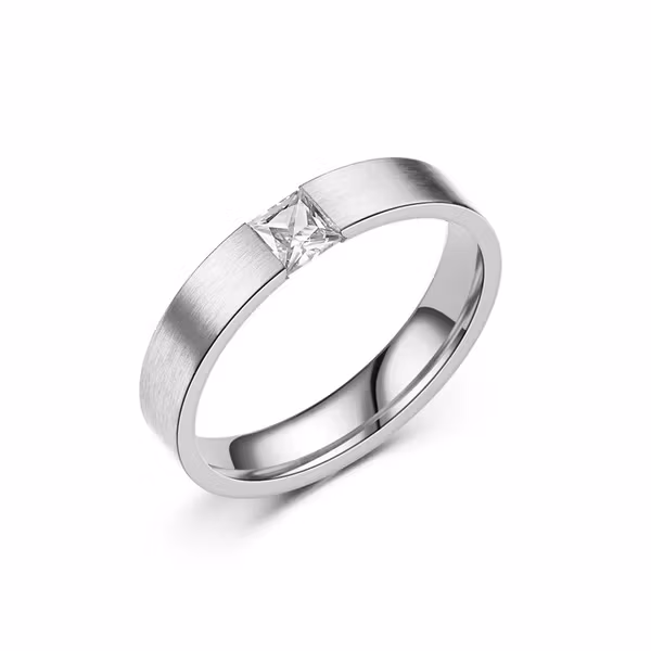 En tidlös ring i borstat rostfritt stål med en kvadratisk, klar zirkoniasten som elegant blickfång. Den matta ytan kontrasterar vackert mot den gnistrande stenen – perfekt för dig som vill ha en stilren ring med lite edge.