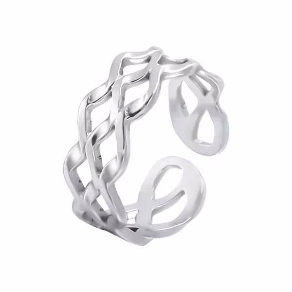 Elegant och modern i ett – denna öppna ring med flätad form ger ett sofistikerat intryck utan att kännas tung. Den luftiga designen ger ringen ett organiskt flöde som passar både till vardags och till fest.