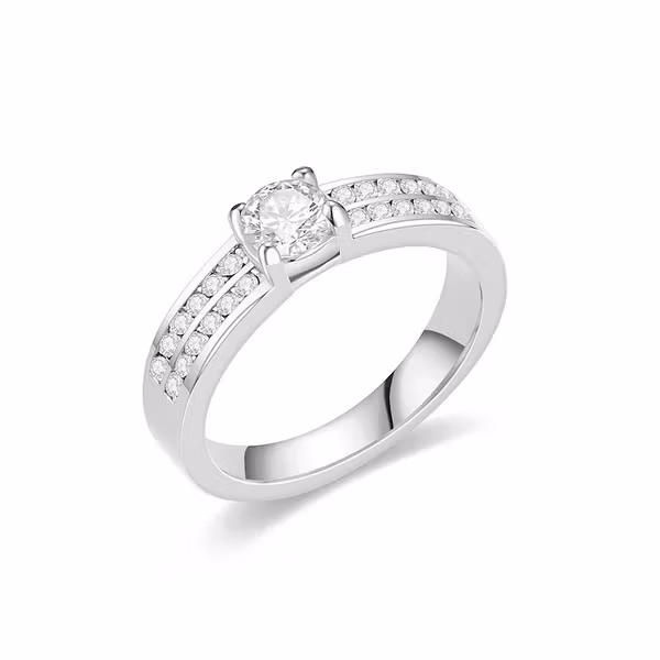En klassisk ring med modern attityd. Den silverfärgade ytan i rostfritt stål kombineras med en centralt placerad gnistrande sten och två rader av mindre stenar längs bandet. En vacker och hållbar ring som ger intryck av äkta lyx – utan att kosta en förmögenhet.